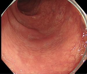 中央の部分に発赤調の平坦に隆起している病変が見えてきましたでしょうか。